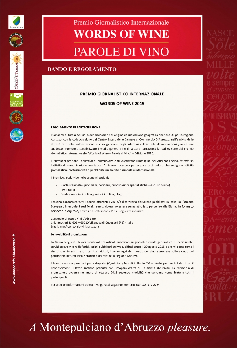 I Consorzi di tutela dei vini a denominazione di origine ed indicazione geografica riconosciuti per la regione Abruzzo, con la collaborazione del Centro Estero delle Camere di Commercio D'Abruzzo, nell'ambito delle attivita di tutela, valorizzazione e cura generale degli interessi relativi alle denominazioni /indicazioni suddette, intendono sensibilizzare i media generalisti e di settore attraverso la realizzazione del Premio giornalistico internazionale "Words of Wine — Parole di Vino" — Edizione 2015.